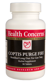 Coptis Purge Fire is intended to treat intense, localized, excess inflammations in individuals with strong constitutions. The formula is a combination of three traditional formulas: Coptis and Scute Combination, Rehmannia and Akebia Combination, and Gentiana Combination (Long Dan Xie Gan Tang). These, along with forsythia (lian qiao), lophatherum (dan zhu ye), phellodendron (huang bai), anemarrhena (zhi mu), gardenia (zhi zi) and sophora (ku shen) have strong anti-bacterial and in some cases, anti-viral effects. Bupleurum (chai hu) invigorates liver qi and is used for prolonged infections. Tang kuei (dang gui) invigorates the blood and alleviates pain. Plantago seed (che qian zi) and alisma (ze xie) facilitate the body's removal of toxins. Inflammation of the excess type tends to produce relatively large amounts of fluids which may appear as discharge or pus. Coptis Purge Fire contains sophora (ku shen) and akebia (mu tong) which clear heat and dry dampness.