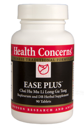 FormulaEase Plus is Chai Hu Mu Li Long Gu Tang (Bupleurum and Dragon Bone Decoction), with Vladimiria souliei (mu xiang) substituted for ju ju be (da zao) to promote better digestive functions. Rhubarb (da huang) eliminates heat through the intestines. Ginseng (ren shen) supports the spleen. Cinnamon (gui zhi) relieves the surface. Ginger (gan jiang) and pinellia (ban xia) transform phlegm. The formula harmonizes by dredging the liver and strengthening the spleen, thus preventing the liver from disrupting the digestion. Liver heat is also cleared by scute (huang qin) to prevent disturbance of heart shen by rising liver yang. Calcium carbonate (mu li) and dragon bone (long gu) weighs upon and holds down the heart shen. Ease Plus treats emotional disturbances that cause a combination of digestive problems, headache, nervousness, and insomnia.