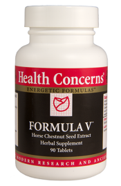 FormulaHorse chestnut seed extract (HCSE) preparations are used for a variety of vein disorders including pain and heaviness of the legs, cramps in the calves, pruritis, leg swelling, varicose veins, edema of the lower limbs and hemorrhoids. A principle constituent is escin (aescin), which is a triterpene glycoside mixture. It has anti-exudative and vascular tightening effects. In double blind, as well as in pharmacological studies, significant improvement has been shown in the symptoms of chronic venous insufficiency. An observation study of 800 general practitioners in Germany, treating over 5000 patients, concluded that leg pain, fatigue, tension, swelling, itching and edema either disappeared, or improved significantly after the administration of horse chestnut seed extract. In a randomized placebo controlled study of 40 patients with venous edema, the effects of HCSE was significant. Measurements of leg circumference showed HCSE to be safe and an effective adjunct to compression therapy. In a clinical study of 22 patients with proven venous insufficiency, capillary filtration was reduced by 22 percent in 3 hours after taking a preparation containing 50 mg of escin. Following German clinical experience, Health Concerns Formula V supplies the recommend 100 mg of escin per day in 3 tablets.
