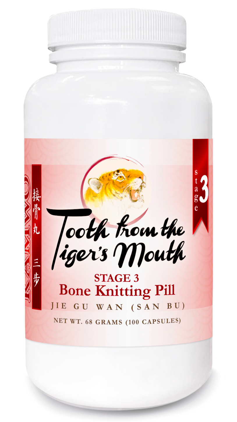 Stage 3 Bone Knitting Pill (Jie Gu Wan San Bu) is derived from an amazingly effective ancient Shaolin Temple formula for treating fractures. It is appropriate in the later stages of fracture healing (weeks 4-6 after the fracture) to speed the knitting of the bones or to treat non-healing fractures. This formula continues to clear any remaining stasis, while incorporating herbs that strongly tonify the blood and strengthen the bones and sinews. It should be used in the 4th to the 6th weeks following a fracture (days 21 to 42).